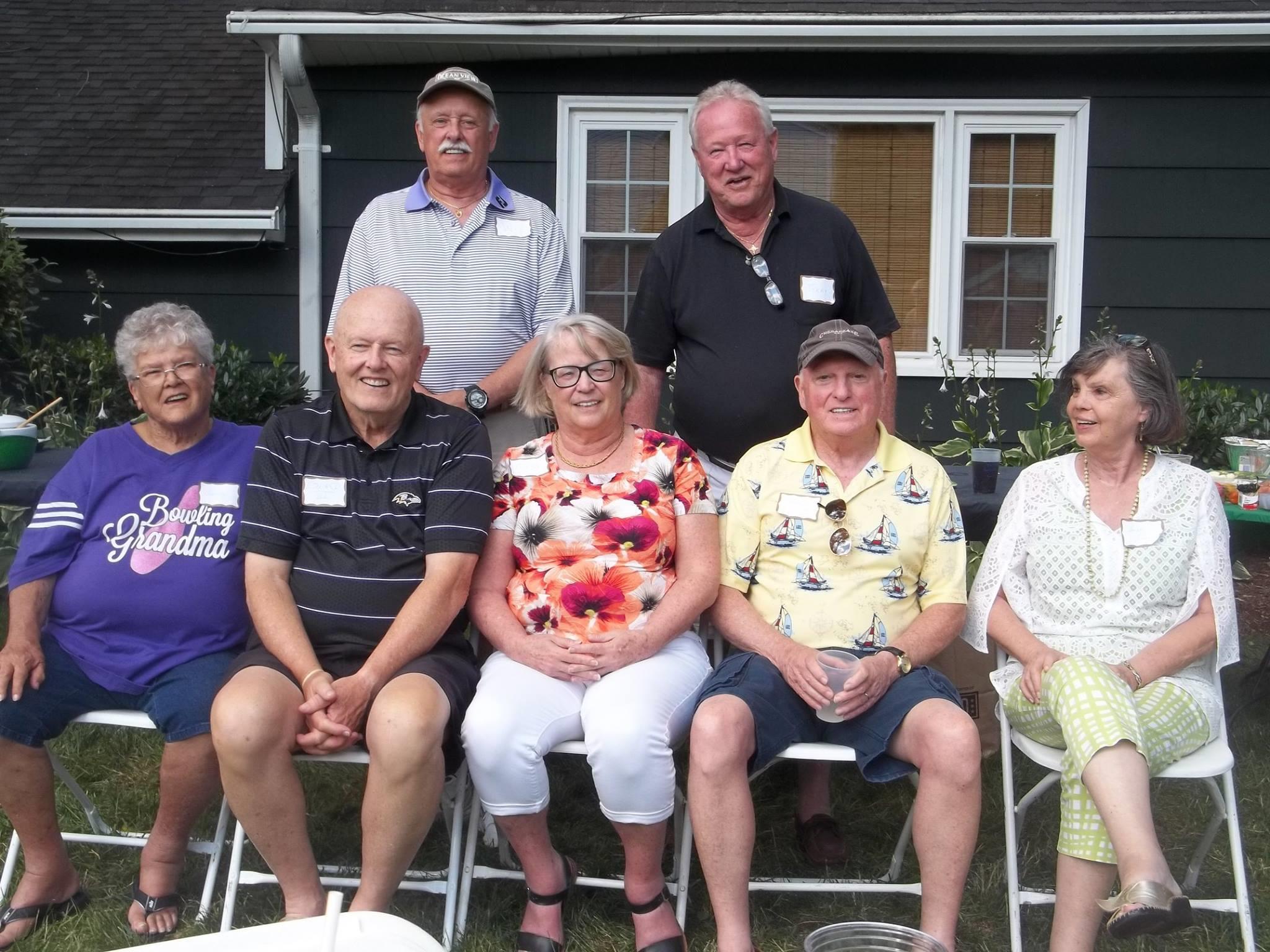 These two photos stick in my memory. The one photo taken at our Aunt Mary Rosenberger's shore house down in Middle River. The others are left to right: Myself (With glove), Dot Rosenberger, Sharon Rosenberger, either Kass Rosenberger or Terry (not sure). Not sure who that is in the grey dress. Kneeling is Jack Rosenberger then my brother Will who is partially hidden holding on to who I think is actually Terry. The second photo is of many of the cousins a few years ago (5 I think) in my backyard taken at the Taylor Family Reunion. I love both of these photos. The ones sitting are Beverly, myself, Terry, Edward II, his sister Sarah Ellis. Standing my brother Will and George/Tom.